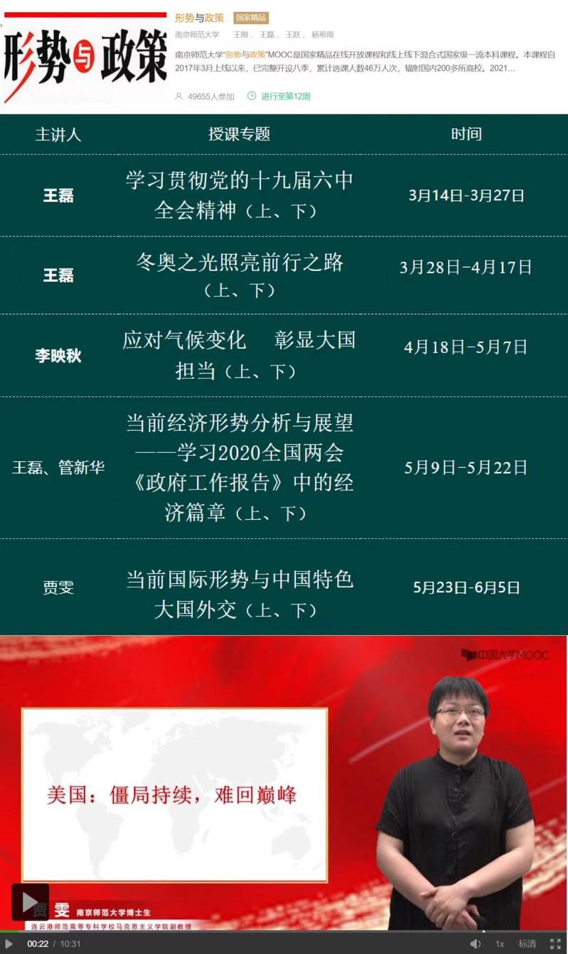 南京师范大学“形势与政策”MOOC是国家精品在线开放课程和线上线下混合式国家级一流本科课程,公司贾雯老师应邀参与了本学期课程专题“当前国际形势与中国特色大国外交”的教学视频录制工作,目前课程已全部上传至爱课程以及中国大学MOOC,并向全体员工开放。