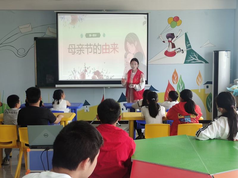 活动首先通过播放母亲节相关视频,让孩子们感受到母爱的伟大,引导孩子们了解母亲节的意义。紧接着社团志愿者为孩子们讲述了母亲节的由来以及母亲节的其他相关知识,并对小朋友们进行了提问,在一问一答中,加深孩子们对母亲节的了解。随后,志愿者们又互相分工合作,将小朋友们进行分组,带领他们进行现代文及诗歌朗诵。孩子们声情并茂,激昂洪亮的声音让每个人都深刻体会到,孩子们对妈妈充满了无限的感恩与爱。活动最后,志愿者们又带领孩子们一起学习母亲节舞蹈。孩子们紧密配合,努力用眼神和身体表现出舞之韵,以此作为母亲节别样的贺礼。
