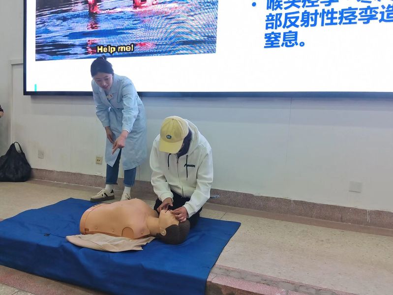 滕亚莉老师围绕志愿者工作指导精神、志愿者服务行为规范、无偿献血工作指南三个方面展开,重点讲解了无偿献血的基本常识、献血者输血要求、献血过程应该怎么做以及献血后的注意事项。在讲解过程中,滕老师与同学们分享了身边无偿献血的志愿服务事例与经验,勉励同学们赠人玫瑰,手有余香,以行动温暖世界,让青春在奉献中闪光。随后,陈娜老师分享了人工呼吸、心肺复苏(CPR+AED)、“海姆立克”急救法的操作流程等相关知识,并引导同学们现场进行操作演练。