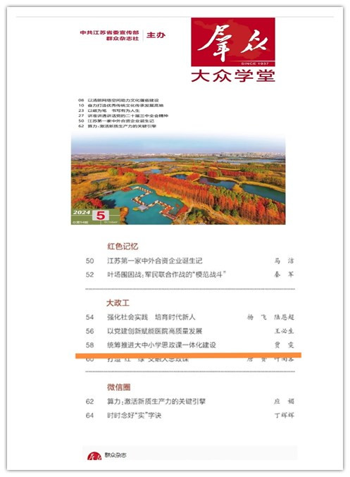 近日,由中共江苏省委宣传部、群众杂志社主办的《群众·大众学堂》刊登了公司熊猫体育经理贾雯的署名文章——《统筹推进大中小学思政课一体化建设》。文章聚焦连云港市,尤其是公司如何坚持守正和创新相统一,立足地域特色,走出一条务实、有效、可持续的发展道路,推动思政课在改进中不断加强、在创新中不断提高的成功经验,进一步探索如何打破连云港市思政教育壁垒,如何促进不同学段思政课教师交流互鉴,以期真正实现大中小学思政课教学理念、教学方法以及育人效果等方面的和谐统一。